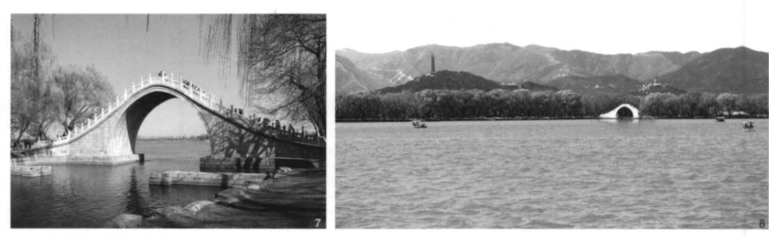 拱桥造型主要由上下两条弧线决定,一般拱桥上弧线只是略微隆起,不能过大,以保证通车方便,同时拱桥跨度还受到施工技术的限制。清漪园的具体情况是,西堤没有通车的要求,桥下是通往玉泉山、玉河的门户,御舟大船的通行需求更为重要,这为桥体造型创新提供了动力。实际功用加以诗意化想象,终于形成了自己的特点(图7)。