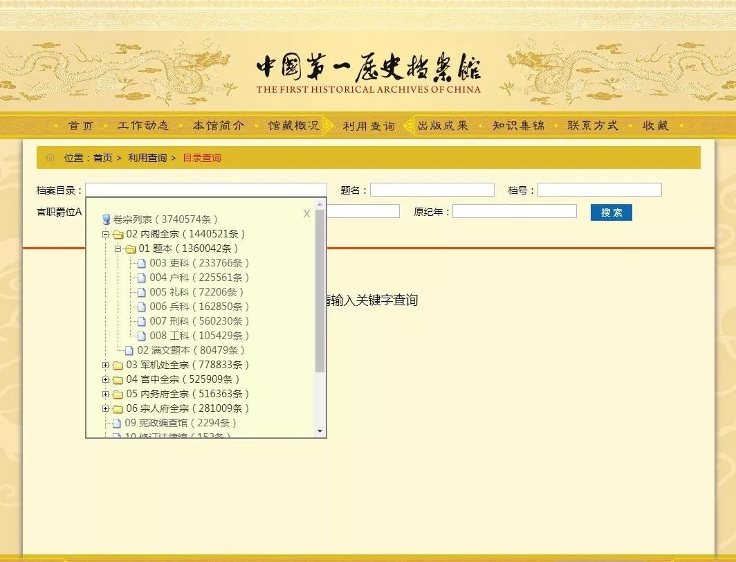 目录查询页面本次公开的122万余条数字化档案目录,共涉及4个全宗的6项档案,主要项目涵盖内阁礼科题本、户科题本、刑科题本、军机处满文录副奏折、宫中汉文请安折、宗人府说堂稿等。上述档案均已在本馆档案信息化管理平台开放查阅。