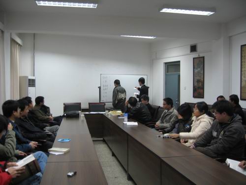 会议由第六届清风学社理事会副社长胡恒同学主持,首先由上届社长孔明丽代表上届理事会作工作总结,主要从五个方面总结概括了其任职期间整个清风学社的工作,同时也提出了不足之处。接着由2008级博士班、硕士班推举出来的六位候选人分别进行了陈述,通过无记名投票,最终08级博士班的王康当选为新一届社长,08级硕士班的谢建东当选为副社长。