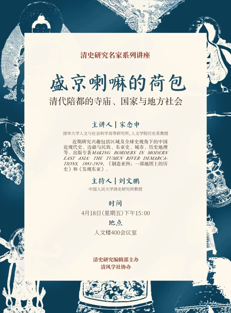 作为清朝入关前的都城,盛京亦是满人政权崇奉藏传佛教的起点所在。清朝前期,盛京城内形成了以实胜寺为核心的所谓“四塔七寺”敕建寺院系统,将陪都打造成一个颇具吸引力的藏传佛教中心。盛京敕建寺院网络,是由国家与宗教共同缔造并维系的。与此同时,这个网络也不可避免地以某种方式整合进地方社会。盛京寺庙中的喇嘛,主体是蒙古人。不论作为个人还是作为群体,蒙古喇嘛身上显示着寺院、国家与社会的相互纠缠。喇嘛的生命轨迹是怎样的?他们与国家的关系是怎样的?他们如何与地方人群互动?他们内部关系又是怎样的?所有这些关系是如何在历史中演化的,特别是在清朝灭亡之后,又遇到怎样的问题?为什么蒙古和藏区的喇嘛寺院在清朝结束后继续维持和发展,而盛京的敕建寺院很快衰落?本讲座利用从官方制度、行政档案、司法及诉讼文书中收集到的零散信息,试图探讨这些问题,以此揭示清代至民国政教关系变化的一个面向。