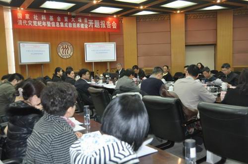 2014年3月8日上午9时,由中国人民大学清史研究所夏明方教授主持的国家社科基金重大项目“清代灾荒纪年暨信息集成数据库建设”开题报告会在逸夫会议中心召开。来自中国人民大学、中国科学院、中国地震局、中国第一历史档案馆、中国社会科学院、复旦大学、中山大学、南开大学、山东大学、中国政法大学等单位近40位专家学者以及课题组成员出席了会议。