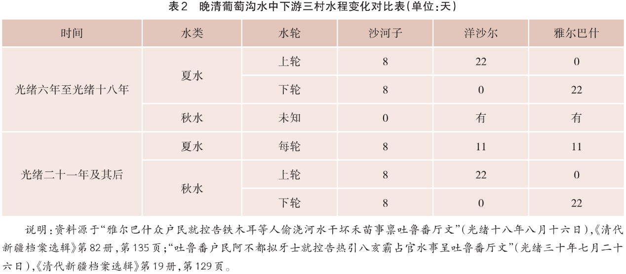 此外,光绪三十年(1904)的另外一则诉讼档案中提到“善后以来,均定章程,每月夏水一轮,沙河子浇八天、洋沙尔十一天、雅尔巴什十一天。秋水二月二轮,头轮沙河子浇八天,洋沙尔浇二十二天,二轮仍沙河子浇八天,雅尔巴什浇二十二天。”结合前文论述可以发现,光绪初年至光绪十八年的《葡萄沟水善后分水章程》中有关夏水的分配是一致的:夏水共计4个月,在沙河子、洋沙尔、雅尔巴什三村之间进行分配,其中沙河子每月浇水一轮,每轮8天;洋沙尔和雅尔巴什两月一轮,每轮各22天;而秋水只在洋沙尔和雅尔巴什之间进行分配,并未言明水轮和水期,但是可以确切知道沙河子是不参与秋水分配的(见表1及其后的归纳文字)。