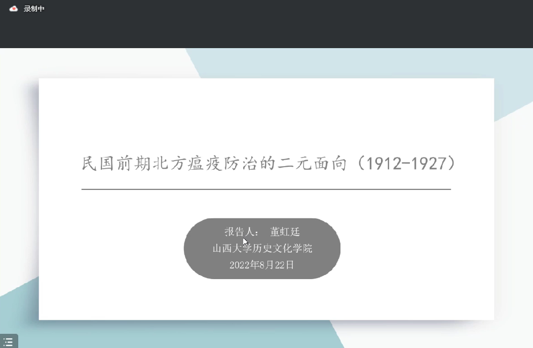 第六位作报告的学员是来自山西大学历史文化学院的董虹廷博士,报告题目为《民国前期北方瘟疫防治的二元面向(1912—1927)》(见图18),报告主要分为五个部分。