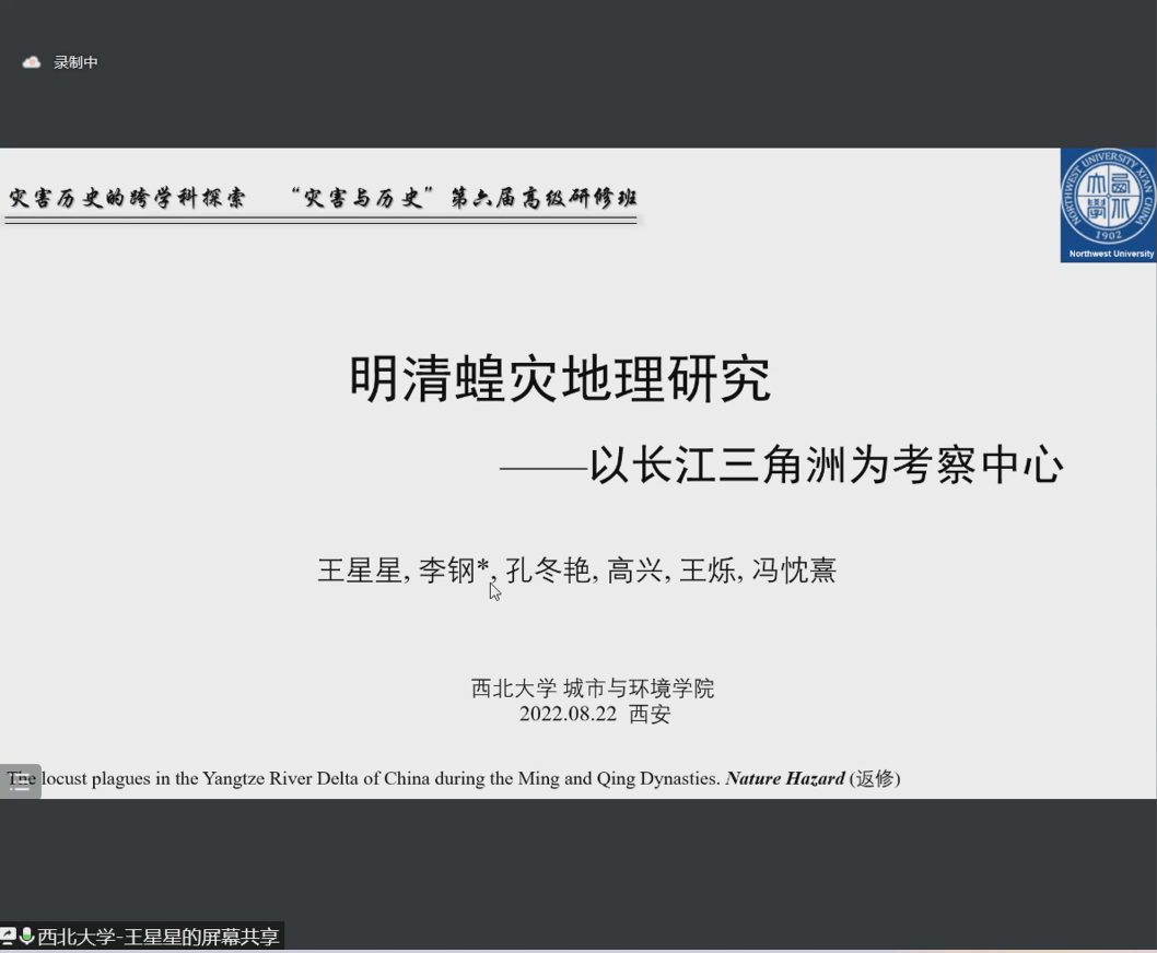 第五位作报告的学员是来自西北大学城市与环境学院的王星星博士,报告题目为《明清蝗灾地理研究—以长江三角洲为考察中心》(见图16),报告主要分为五部分。