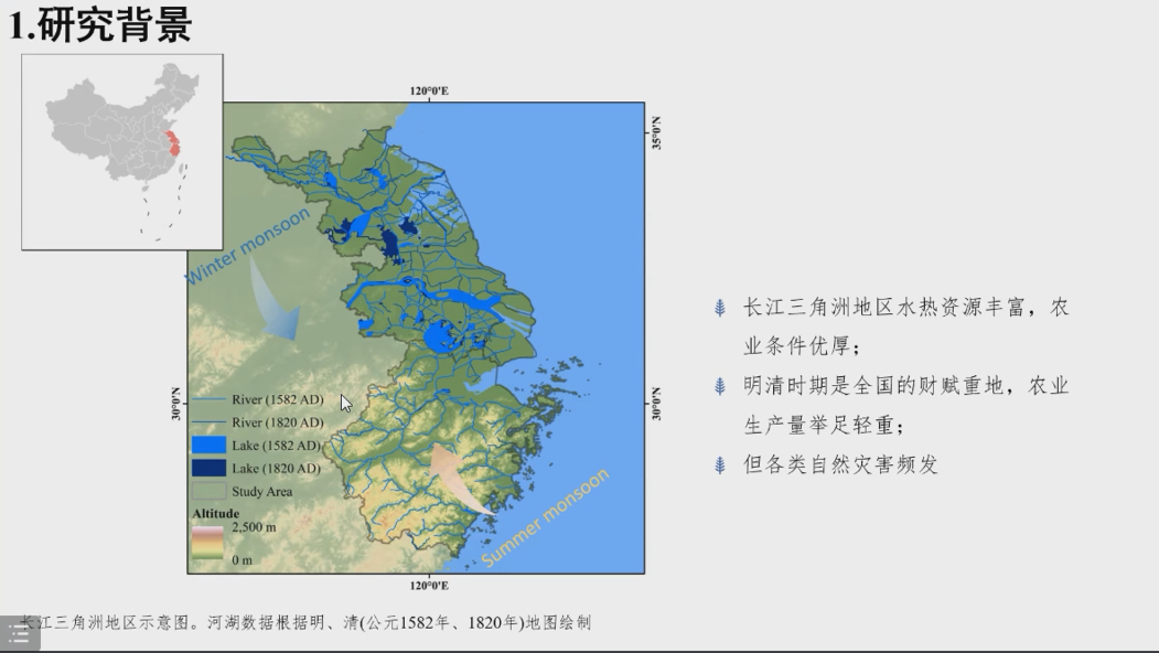 第一部分中,王博士对研究意义、背景进行介绍(见图17)。第二部分“数据与方法”,先对蝗虫数据以及米价数据、气温数据以及湖泊与河流等进行介绍,随后讲述其对于蝗灾数据的处理情况以及根据蝗灾的严重程度将其划分为蝗灾年、大蝗年、极端蝗灾事件等三类。第三部分,王博士从蝗灾动态的时间特征、空间特征两方面展开介绍,在讲述蝗灾动态的时间特征时,又总结出蝗灾的频发期。第四部分“蝗灾动态与气候变化和社会响应”,认为长江三角洲地区的适宜温度、湿度为蝗灾生存提供了基本热量、水源条件,指出蝗灾大发年份一般对应粮价上涨年;并明清时期蝗灾防治措施在法规制度、思想以及技术等方面取得的进步。第五部分为报告总结。