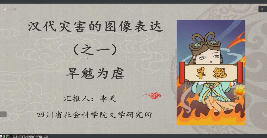 第二位作报告的学员是来自四川省社会科学院文学研究所的李昊老师,报告题目为《汉代灾害的图像表达(之一)——旱魃为虐》(见图13),报告主要分为三个部分。