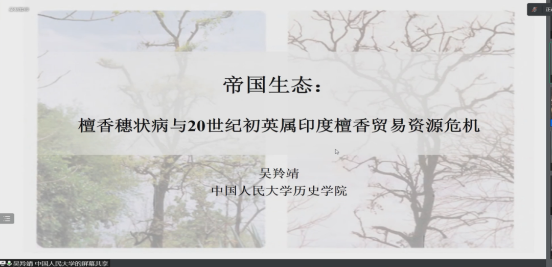 第一位报告人是国人民大学历史学院的吴羚靖,主题为《帝国生态:檀香穗状病20世纪初英属印度檀香贸易资源危机》(见图11)。吴羚靖博士介绍题目的由来以及对于该研究的展望后进行主体内容的汇报。