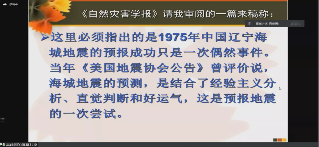 下午三点,中国灾害防御协会灾害史专业委员会名誉主任、中国地震局高建国研究员以《中国地震群测群防史》为主题的第二场专题讲座准时开始(见图5),山西大学历史文化学院副院长周亚教授担任主持人。