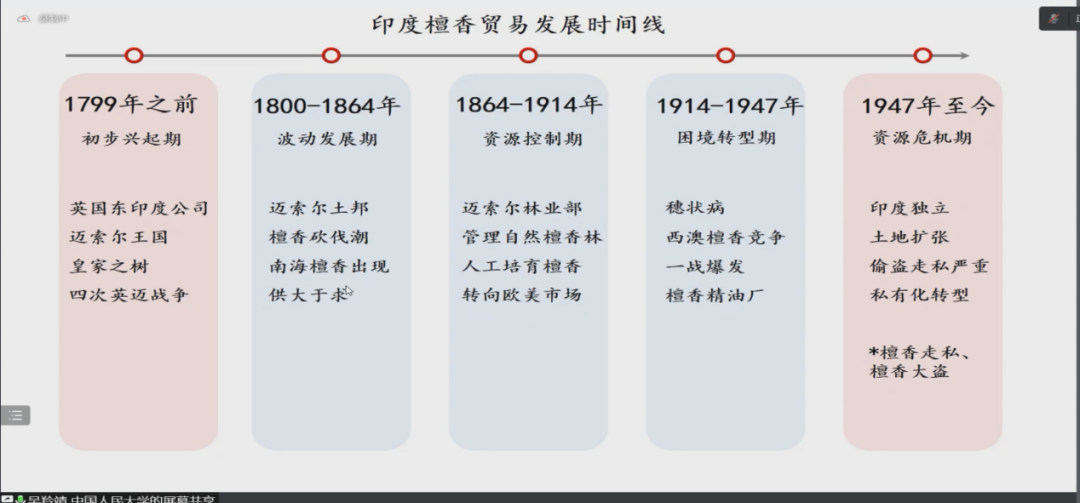 吴博士报告的主体内容分为三个部分。第一部分的主题为“缘起:从皇家之树到疾病之树”,围绕这个主题,吴博士首先介绍檀香贸易发展时间线的五个时期(见图12),她认为在19世纪末20世纪初影响南印度檀香贸易发展的原因是穗状病的快速肆虐。第二部分围绕“致病因之争与病害防治的扩大化”主题展开,她认为檀香穗状病快速肆虐的原因是由檀香具有的半寄生植物特性所导致的,檀香的生长需要马缨丹作为宿主,因当时的欧洲人对于檀香植物特性认识不够,故为治理穗状病扩大而开展根除马缨丹运动,反而导致檀香木产量下降的结果。第三部分“环环相扣的经济、社会与生态影响”,论述了穗状病带来的三方面影响,即阻碍了印度檀香业的现代转型,加剧了对于檀香管理的困难甚至出现走私现象,使得印度在国际檀香市场的占有率下降。