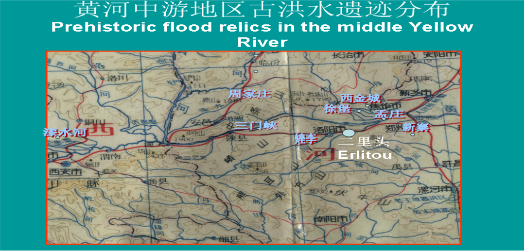 接下来,夏教授介绍对于黄河中游地区的考察情况,认为中游地区被洪水淹没的古遗迹数量更多。通过遗迹分布图(见图3)发现,主要包括河南西金城遗址古洪水遗迹、新寨遗址新寨期(1830—1680aBC)古洪水遗迹以及二里头遗址古洪水遗迹。夏教授指出,二里头遗址相对于前两个遗址来说,遗存尤为丰富。