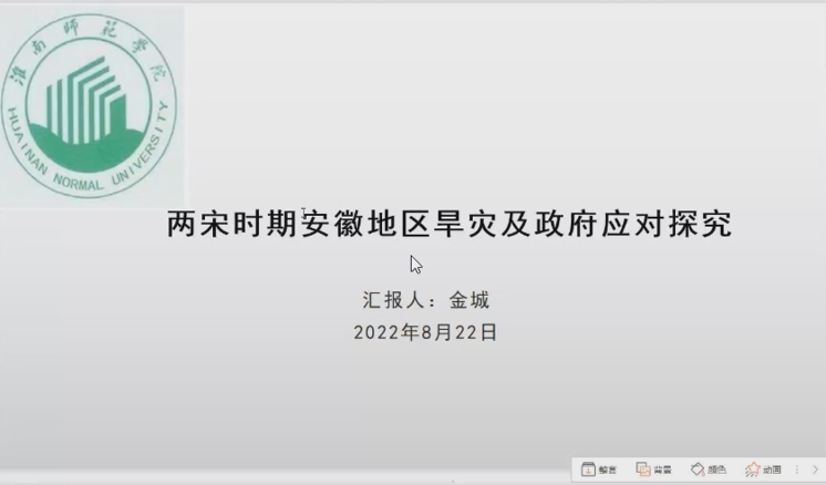 第三位作报告的学员是来自淮南师范学院的金城老师,报告题目为《两宋时期安徽地区旱灾及政府应对探究》(见图14),报告主要分为五部分。