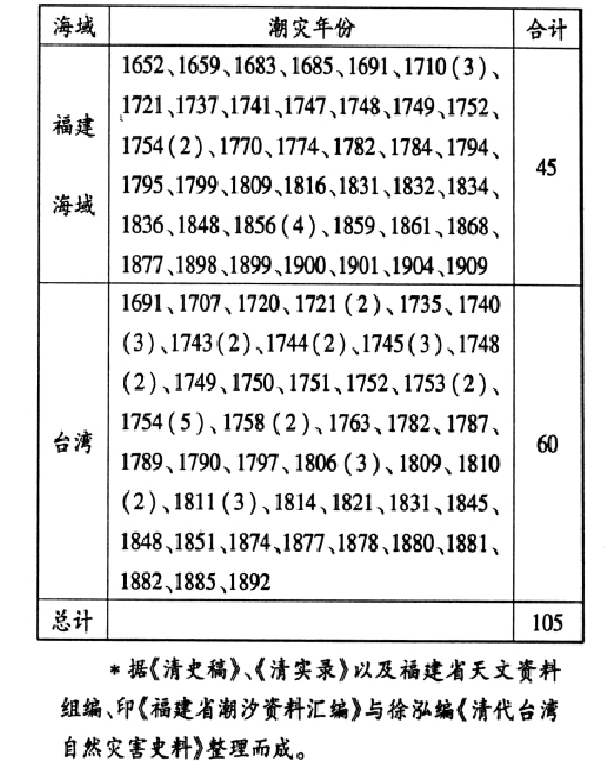 在《清实录》以及福建沿海各地方志、徐泓编《清代台湾自然灾害史料》中存有大量的福建风暴潮灾记录,整理分析这些记录,可以成为我们研究清代福建海洋风暴潮灾害的规律的新视角。清代福建较大潮灾分布如右表所示。