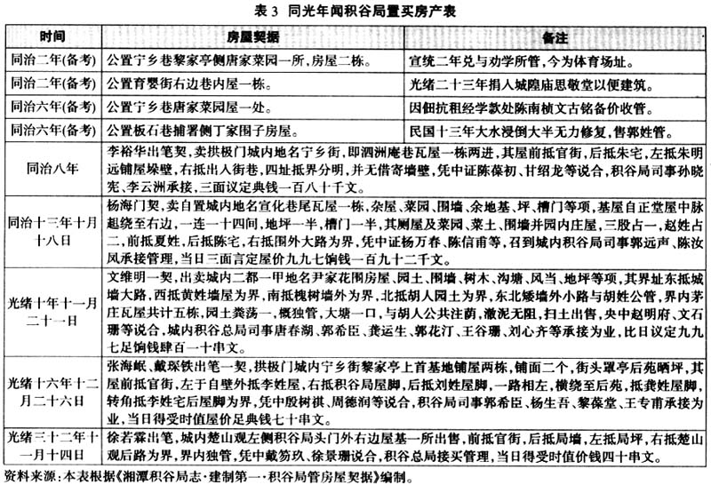 围绕在罗汝怀周围的还有李家杞、欧阳兆熊、何拔秀等人。从表2中我们可以看出,他们都是有一定科举功名的士绅,是能够进入县志的地方名人。虽然欧阳兆熊和李家杞(杏九)在地方积谷事务记载中出现的时间较早,但到了同治初年,积谷局司事都以罗汝怀为核心。这不仅由于与积谷局相关的公文都是由罗拟写,其他如司事的身份、在地方上的地位和关系网络等方面欧、李二人亦不如罗。从表2我们可看出在王闿运的描述中,欧阳兆熊与李家杞是属于“豪侠”一类的人物,这在一定程度上影响了他们在地方上的形象和威望。② 何拔秀虽是道光三十年进士,功名比罗汝怀高,但资历不如罗老,从他请罗汝怀代写禀稿一事看,他对罗应是相当敬重的。而罗汝怀对于司事选择上的一些建议③ 导致积谷局在一段时期应该是以某一位司事为核心的权力集团。 从这几位积谷局创设时期主要司事的关系来看,罗汝怀是这一集团的核心,所以他在积谷局上的经营理念对于我们认识积谷局是非常关键的。罗汝怀是一个典型的具有经世致用思想的湖湘士绅,虽然没有资料表明他本人参与米谷贸易,但他对于湘潭当地的米谷贸易有很深刻的了解,他非常关心米价,希望借官方的权威来调节米价,以求买卖双方的双赢,最终达到维护社会秩序的目的(罗汝怀,1995:《绿漪草堂文集外集》卷二之《救荒条陈》)。 关于道光末年积谷散失的原因,罗汝怀认为,“潭邑李前县于(道)光(咸)丰之间劝积义谷四万一千余硕,建仓存贮生息,平时既得通挪以资不足,今岁尤赖斗硕以济方饥,十年以来,成效可睹,闻各乡有二三里中积谷至六七百硕者,以绅耆多公正之人,故收放无耗失之弊,无如良莠不一,往往筅者侵吞,借者拖欠,匪徒?{义谷为欲壑,懦民视积谷为畏途,不知种种弊窦由在乡未有归聚之仓,在城未设清理之局,未及清年款,故愈积愈累,愈累愈深耳”(《湘潭积谷局志·建制第一·同治元年罗邑侯才衎示并条规》)。所以乡中建仓、城中设局是他所总结的解决之道?。乡中建仓不是罗汝怀能够完全操控的,而在城中设积谷局既顺应稳定社会秩序的需要,又在县官的支持下具有可操作性。同治二年,积谷局在城内原社仓基址设立,并确立了积谷章程(《湘潭积谷局志·建制第一·同治二年十月张邑侯申议积谷示并条规》)。这一章程对城局和各都义仓的管理办法设计得相当详细,积谷局所积米谷最初来源于田主和佃户,米谷根据田亩数按一定比例被强制征收。仓正、仓长、保甲在义仓的管理上互为监督,义谷的出借也有一定限制,不能随意,也不是任何人都可以借予。积谷局是为应清理义仓之时需而设立的机构,所以积谷章程主要是针对各都甲义仓所制定。而义仓的运作一定意义上是以生息的方式产生利润的过程。④ 至于利息的多少,在一些章程中有模糊的规定,但在实际操作中利息的设定几乎是由掌管谷仓的仓长仓正来确定的,这就在很大程度上给予了他们权利,义仓之赈济功能往往与仓长自身利益的实现相辅而成。 另外,由于荒政历来是地方官政绩考核的一个重要部分,并且关系到地方秩序的稳定,官员对于积谷局管理的参与是比较积极的。从《湘潭积谷局志·事纪》的记载来看,从积谷局设立之始,县官就非常重视。同治元年知县罗才衍、同治二年知县张景垣、同治四年知县董宏远、同治九年署知县洪锡绶、同治十一年知县麻维绪、光绪元年知县吴秉慈、光绪四年知县黄教镕、光绪六年知县严鸣琦、光绪十四年知县陈嘉榆、光绪二十一年知县彭飞熊、光绪二十三年知县陈宝树、光绪二十七年知县刘燨等都积极参与到积谷局的管理中来,或核查仓谷,或制定章程,这些事迹都被简要记录下来。如同治十一年知县麻维绪对全县义仓的调查即被认为是比较切合实际的,其调查报告被收录到光绪十五年的县志中。另外,光绪十七年局用经费始列表册报县著为定例,从这点来看,积谷局的运作一直在官方的监督之下。 (二)积谷局的运作 从积谷局房产的逐渐置买、仓谷数量的逐渐增长和赈济事务的逐渐开拓等方面看,积谷局在湘潭地方事务中的地位亦在逐渐提高。 (1)积谷局产业的增加。主要表现在同光年间积谷局置买房产上(见表3),据光绪二十五年的局规,这些房产都用来出租,岁收一百六十余串(《湘潭积谷局志·事纪第三·局规七条》)。