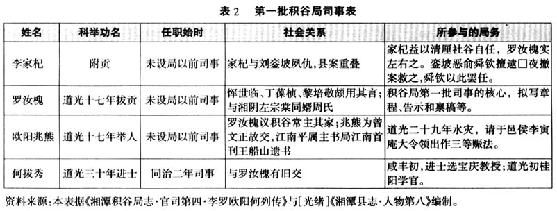 表一:  江沅流民就食湘潭,在这种情况下,知县李春暄“振济有方,境内安堵,而县人有积谷之议,幕友殷利谦赞成之,始破官习,弛文法,与士民相通,接一岁积谷四万余石,县积谷至今为利”(《湘潭积谷局志·官司第四》)。欧阳兆熊“请于邑侯李寅庵大令领出作三等赈法,农民振借,次贫振粜,极贫振施,是岁秋收有年,得以全数归仓,因人心戒惧皆有防饥之意”(欧阳兆熊,1984:19)。于是“逐甲按亩派捐,积少成多,以为备荒之用,似此思患,预防自可有备无患,将来偶值偏灾,办理亦形饶裕”(《湘潭积谷局志·建制第一·道光二十九年七月李邑侯春暄示并章程》)。天灾加速了湘潭各都甲建立义谷仓储的步伐,也成为再遭太平天国之乱后同治初年的官员提出设立城中之积谷局、合官民之力以成仓储思想的基础。同治二年,积谷局在城内原社仓基址设立,作为社仓的接替机构出现,并与乡中义仓形成纵向联结的关系。 二、积谷局的设立与运作 (一)积谷局的设立 积谷局是作为太平天国战争之后的善后组织由官方倡导、士绅合作建立起来的。梁元生指出,“局”之性质为清代一般官僚行政系统(formal bureaucracy)以外的临时性组织,但又不同于非官僚系统的“幕僚”组织或地方上由绅士耆老组成的公益团体,此二者属于非官僚行政组织(extra bureaucracy)。“局”为官办,为政府机构,但不是“常官”,而局中管理人员,除官员之外,也有绅士参与,可算是处于正规和非正规的官僚系统(formal bureaucracy and informal bureaucracy)之间,是官绅及官商携手合作、共同管理的一个机构。梁元生认为积谷局有应变开局之含义,这在同治初年的告示中已有表露(梁元生,1999)。 时人多认为,同治初年天灾引起米价上涨,导致社会不稳定,而致设立积谷局。[光绪]《湘潭县志·五行之九》记载:“同治元年,大水”。而欧阳兆熊记录:“同治元年复蝗旱,青黄不接之际,米价翔贵,义谷已发完,尚不能敷”(欧阳兆熊,1984:19)。知县罗才衍以欧阳兆熊为办理赈济事务的人才,登门求助。罗才衍也在同年的告示中对这一年的谷价腾贵稍作总结:“本年谷价贵腾,四处空虚,几于无可市买,赖稍存仓谷及绅商捐赀买米,借给与平粜减粜兼施,始得幸济艰难”(《湘潭积谷局志·建制第一·同治元年罗邑侯才衍示并条规》)。 以上三者所指出的同治元年湘潭地区米价上涨的诸种原因,大致包括蝗旱、大水等天灾和义谷不足两个原因。而实际情况却并非如此简单。① 岁饥和米贵,在于道光末年兴议的积谷经过咸丰一朝太平天国战乱之后,各都甲所储谷米荡然无存,或被侵蚀、或被征用,这也是同治元年的谷案及其引起的社会秩序紊乱的最根本原因。同治初年地方士绅提出通过清理谷仓来恢复地方秩序,并提出设局作为县城对于地方义仓的管理手段,可见积谷局是作为战后善后机构出现的。 参与积谷局管理的第一批司事(参见表2)中很多与湘军有着千丝万缕的关系。罗汝怀与曾国藩年龄相近,是曾国藩的支持者,除了其子罗萱参加湘军这层关系,事实上,罗氏有很多族人参加了湘军,而且很多立有军功,如罗德煌,“粤西寇事起,公从战武宣平南,又回守永州龙虎关。咸丰元年从防岳州,明年曾文正公治师偿沙,檄公入营教习”,咸丰八年积功擢守备加都司衔,赏戴蓝翎换花翎,领湘潭水师(《赐封建威将军罗公家传》,《古磉洲罗氏族谱》卷末)。罗汝怀、欧阳兆熊被一些研究曾国藩幕府的学者归于曾国藩幕僚和军师(李鼎芳编著,1985:22;刘建强,2005:47)。 罗汝怀是策划设立积谷局和参与积谷局管理的核心人物。王闿运对于罗汝怀的评价是,“喜言时事,以人心风俗为忧,世居田间,尤勤农疾苦,常以积谷禁酿酒为王政之首,闻者多不乐酒禁,而汝怀言之不已,遇院司府县相识者,辄申其议,颇见施行,其积谷至三四通饬、条教、章程皆手定稿草,至今县中积谷冠列县,汝怀力也”([光绪]《湘潭县志·人物第八·罗欧阳列传第三十七》)。通过对照《湘潭积谷局志》和《绿漪草堂文集外集》,我们可以发现,《湘潭积谷局志》中《同治元年罗邑侯才衍示并条规》、《同治二年五月张邑侯景垣改社仓为局并筹经费示》、《同治二年十月张邑侯申议积谷示并条规》、《同治五年县人罗汝槐、陈曾琳、曹光诏、刘传润等公启通筹城局经费》等告示并章程条规和禀稿的内容,以及何拔秀给知县张景垣的禀稿都出自罗汝怀之手(《湘潭积谷局志·官司第四》之“何拔秀”条;罗汝怀,1995:《绿漪草堂外集·积谷完竣汇恳核详禀(代)》),并且尚有多篇关于积谷和救荒的文章并没收录到《湘潭积谷局志》内(罗汝怀,1995:《绿漪草堂文集外集》之《拟济荒示》、《救荒条陈》、《拟官洲召种杂粮筹备积谷经费呈》等),从罗汝怀编辑的《湖南文征》中收录的文章内容来看,我们也能了解到此人对积谷、保甲、育婴等地方公共事务的热心。《湘潭积谷局志》的编者认为罗汝怀是创设积谷局的核心人物,各级官府官员都采纳他的言论而重视积谷:“汝槐喜言积谷,当要大府示禁煮酒熬糖,及劝民积谷,恽世临、丁葆桢、黎培敬颇用其言”(《湘潭积谷局志·官司第四》)。这说明白积谷局设立之初起,官员的作用主要在于支持士绅的建议和实践。