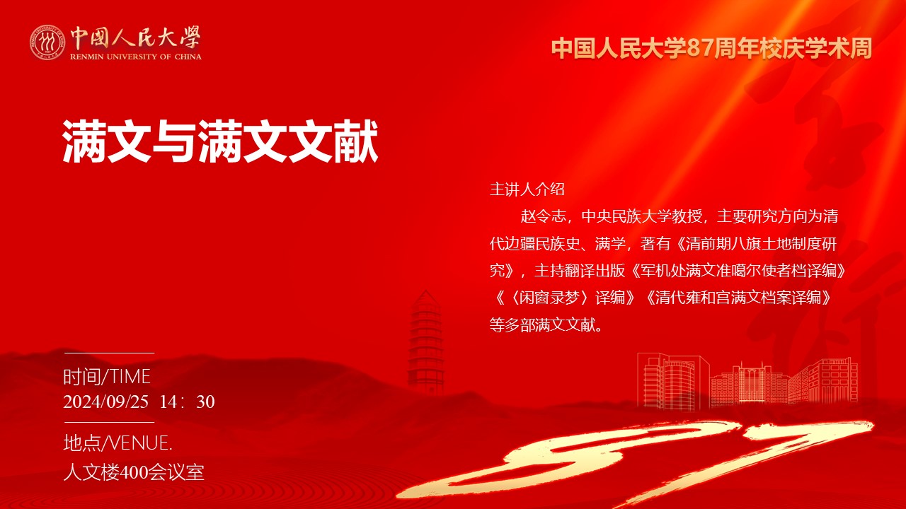 2024年9月25日下午,中国人民大学87周年校庆学术活动——“清代边疆民族史系列讲座”第1讲成功举办,本次活动由中国人民大学清史研究所主办、满文文献研究中心承办。讲座邀请了中央民族大学历史文化学院赵令志教授,讲座主题为《满文与满文文献》,满文文献研究中心执行主任惠男老师主持,校内外师生四十余人参加。