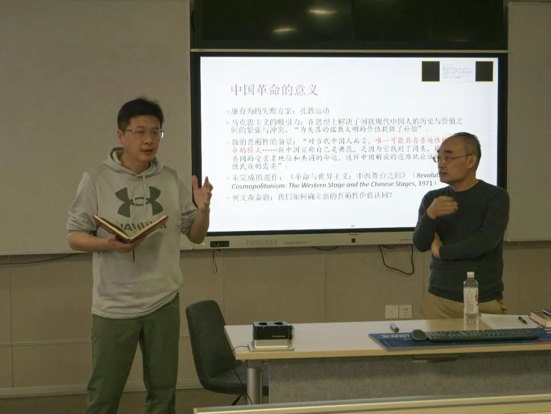 而后,季剑青老师阐述了中国革命的伟大意义,先讲述康有为发起的孔教运动及其失败的原因。孔教运动无法解决近代中国人的思想困惑,而马克思主义在在思想上解决了困扰现代中国人的历史与价值之间的紧张与冲突,为失落的儒教文明的价值提供了补偿,并提供了新的普遍性的前景。季剑青老师还介绍了列文森未完成的遗作:《革命与世界主义:中西舞台之间》(Revolution and Cosmopolitanism: The Western Stage and the Chinese Stages, 1971),认为新中国展现了世界主义气象和普遍价值。最后,季剑青老师提到了“列文森命题”,并抛出了我们如何确立新的普遍性价值认同这一问题供在场师生思考。